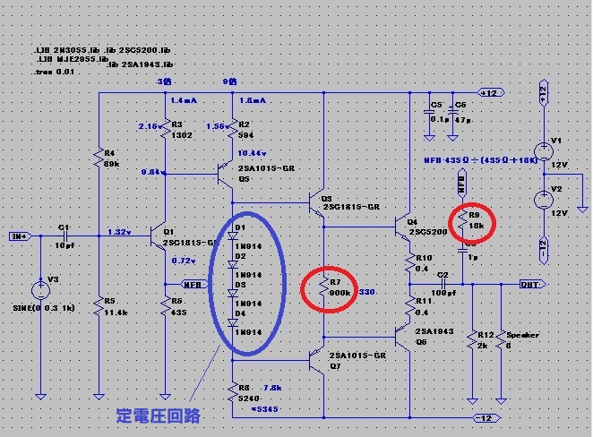 電子回路 2025.04.13 トランジスタPPアンプの後段を初段に繋げました。 定電圧回路はダイオード4つにしました。ツェナー1個かトランジスタ1個の方が良いのですが、懐かしい使い方だったので(笑 ダイオード4つの定電圧回路の場合、エミッタ抵抗R7は意外に重要です。これは無くても動作しますが、これを大きめの抵抗を使うとFFT値で歪が減ったように感じます(笑 NFBのR9抵抗は可変抵抗にして調整した方が良いと思います。 高調波と40dB以上の差があります。良い音のような予感がします(笑